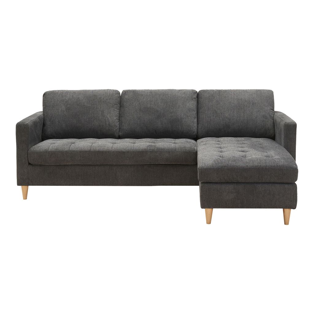Elegant mörkgrå hörnsoffa i polyester med stabila ben i gummiträ. Perfekt för både stil och komfort i vardagsrummet.