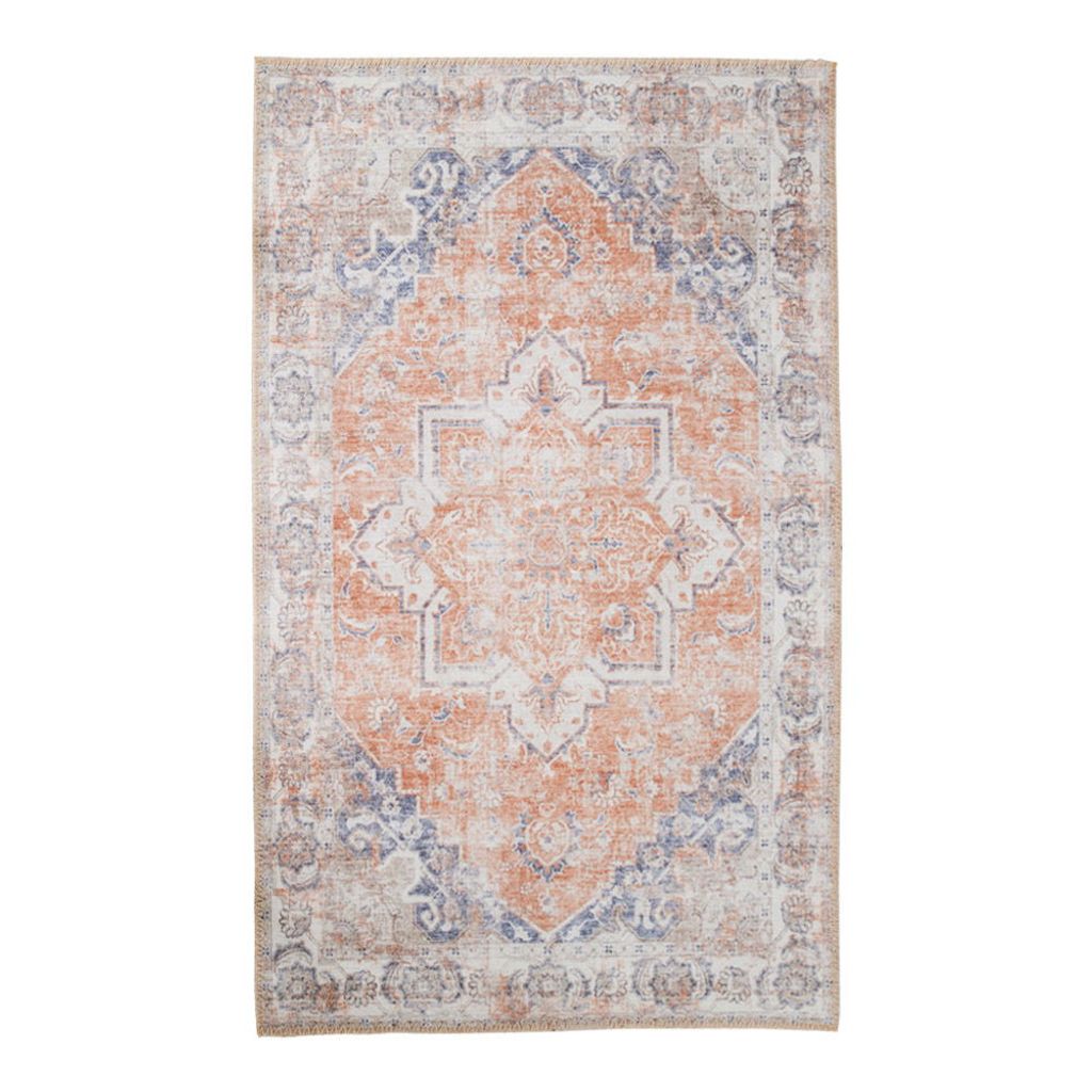 Elegant matta i chenille polyester med vackra blå och orange toner. Perfekt för att lyfta ditt rum med stil.