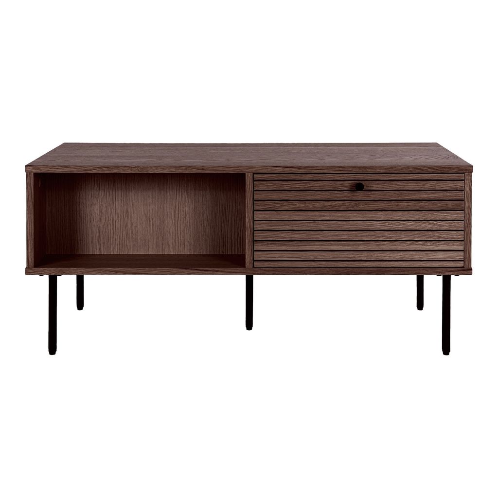 Den stabila stålramen och de rena linjerna bidrar till bordets moderna estetik, medan den praktiska förvaringslådan med ribbdesign erbjuder en lättillgänglig plats för dina vardagsprylar. Detta soffbord är inte bara vackert utan också mycket funktionellt.