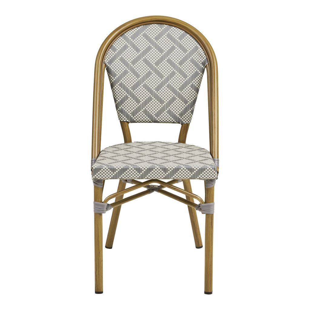 Stolens ryggstöd och sits är vackert flätade i ett geometriskt mönster som ger visuellt intresse och en bekväm sittupplevelse. Den robusta aluminiumramen med träliknande finish skapar en naturlig känsla som passar perfekt i trädgården eller på uteplatsen.