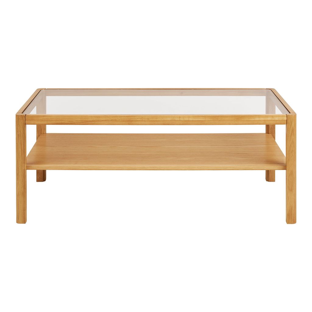 Soffbordet är tillverkat av högkvalitativ ek och ekfaner, förstärkt med MDF för extra hållbarhet. Den tempererade glaskivan ger en elegant touch och gör det enkelt att rengöra ytan, samtidigt som det ger ett luftigt intryck i rummet. Under glaskivan finns en praktisk hylla för förvaring av böcker, tidningar eller fjärrkontroller.