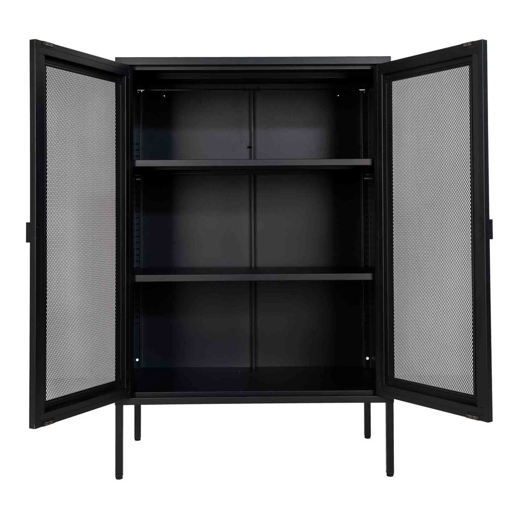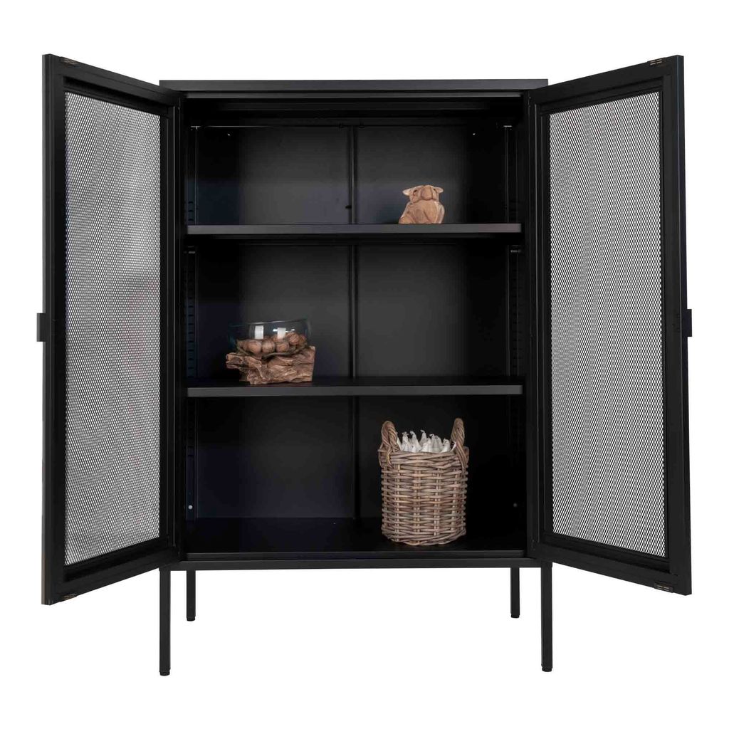 House Nordic Melbourne Skåp kombinerar stil och funktionalitet i ett elegant paket. Den svarta stålramen ger en modern och industriell känsla, medan de perforerade dörrarna tillför en unik design som samtidigt möjliggör ventilation. Skåpet är rymligt och erbjuder gott om plats för olika förvaringsbehov.