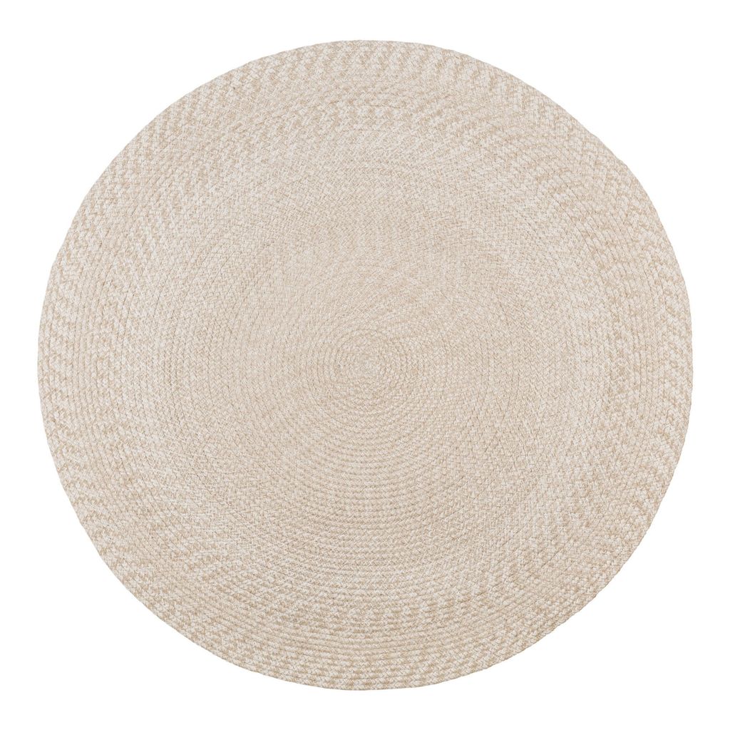 Elegant rund matta i återvunnen PET, perfekt för både inomhus- och utomhusbruk. Stilren design i sandfärg.