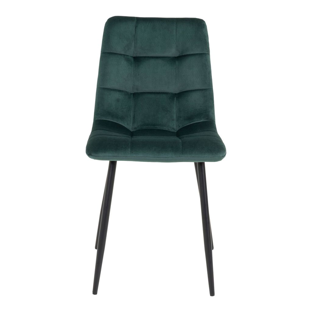 Elegant matstol i mörkgrön sammet med robust stålram. Perfekt för stilfulla matrum.