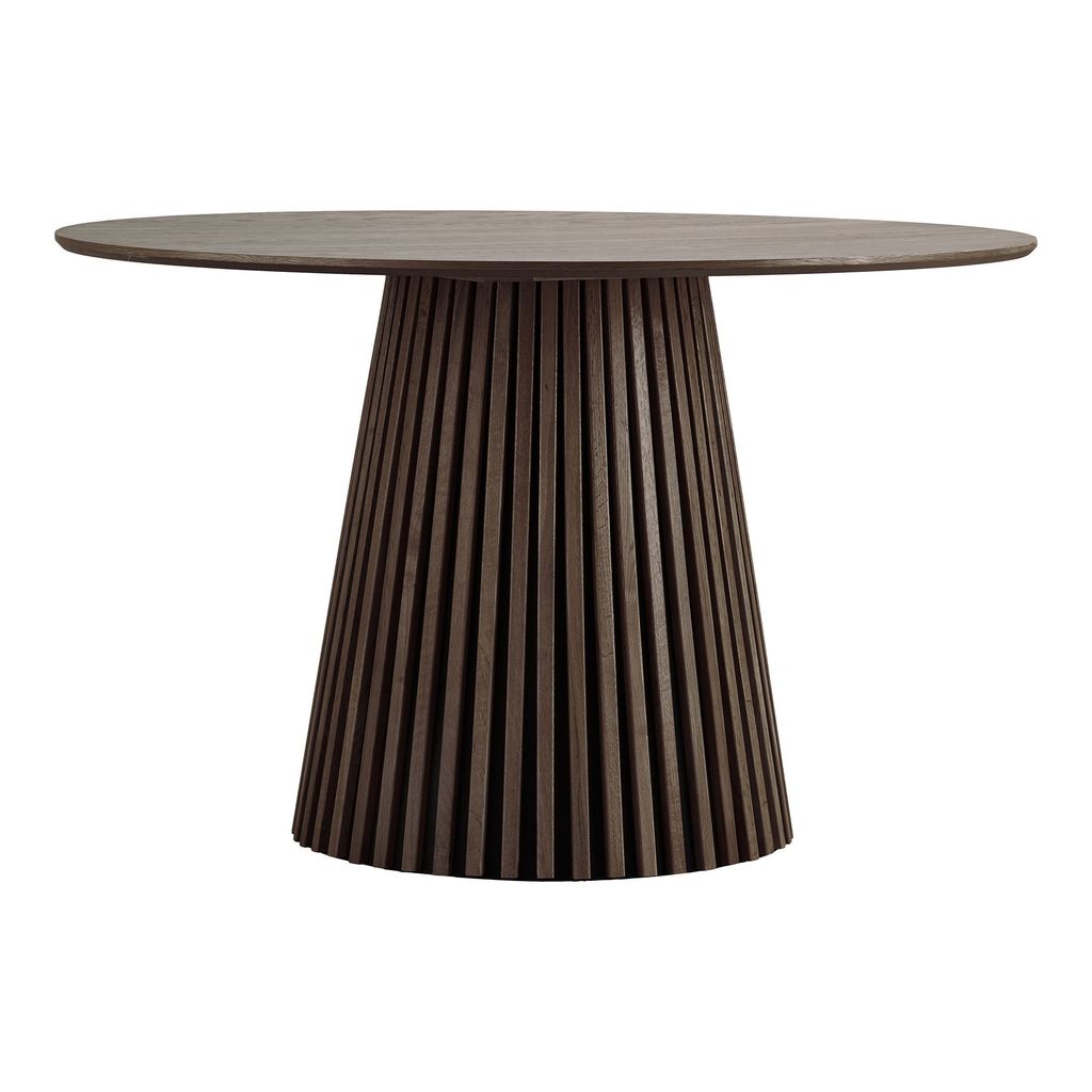 Elegant runt matbord i ekfanér med en distinkt rökt finish och unik design för moderna matrum.