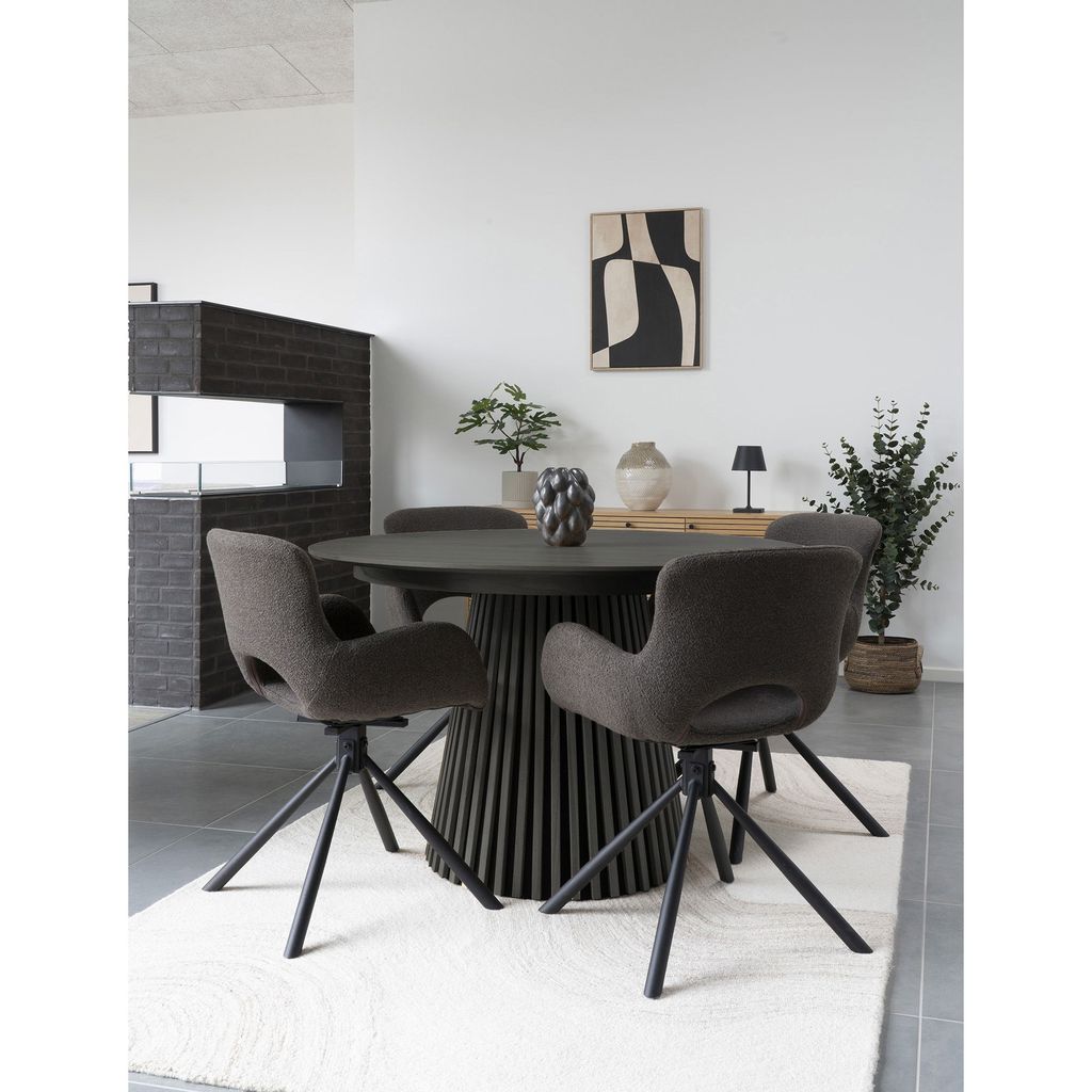 Elegant runt matbord i svart ekfanér med modern design och stabil konstruktion. Perfekt för stilrena matsalar.