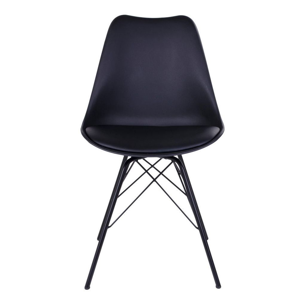 Elegant matstol i svart PU-läder med slitstark plast och metallben. Perfekt för moderna hem.
