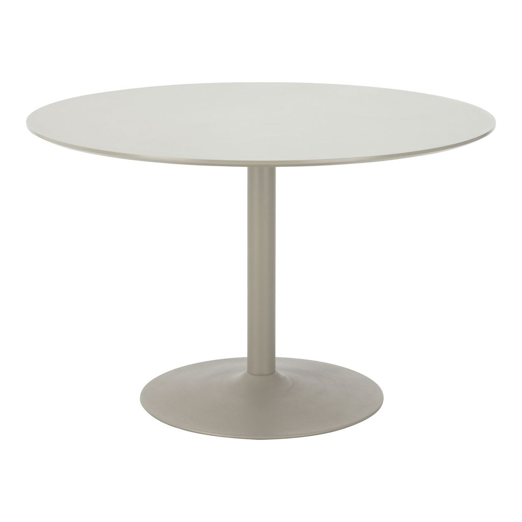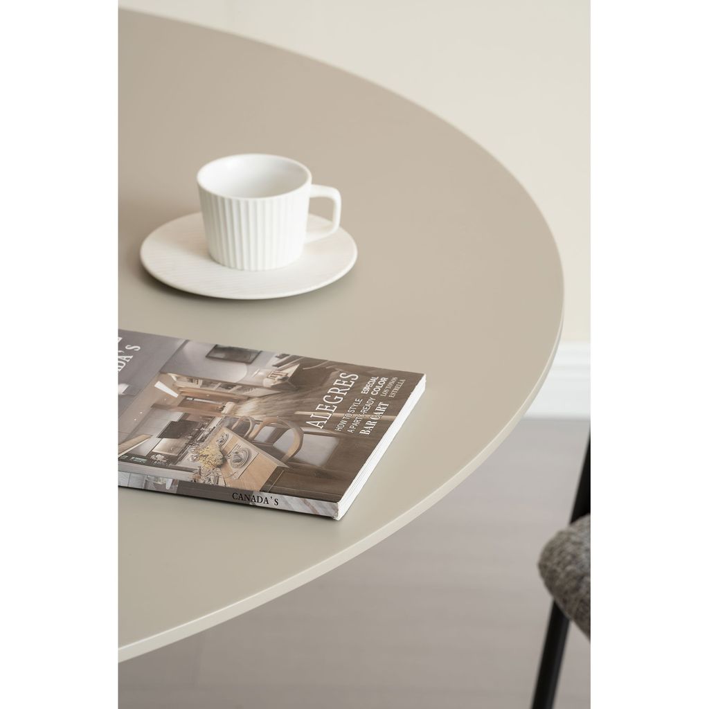 Elegant runt matbord i sandfärgad MDF och stål som kombinerar stil och funktionalitet.