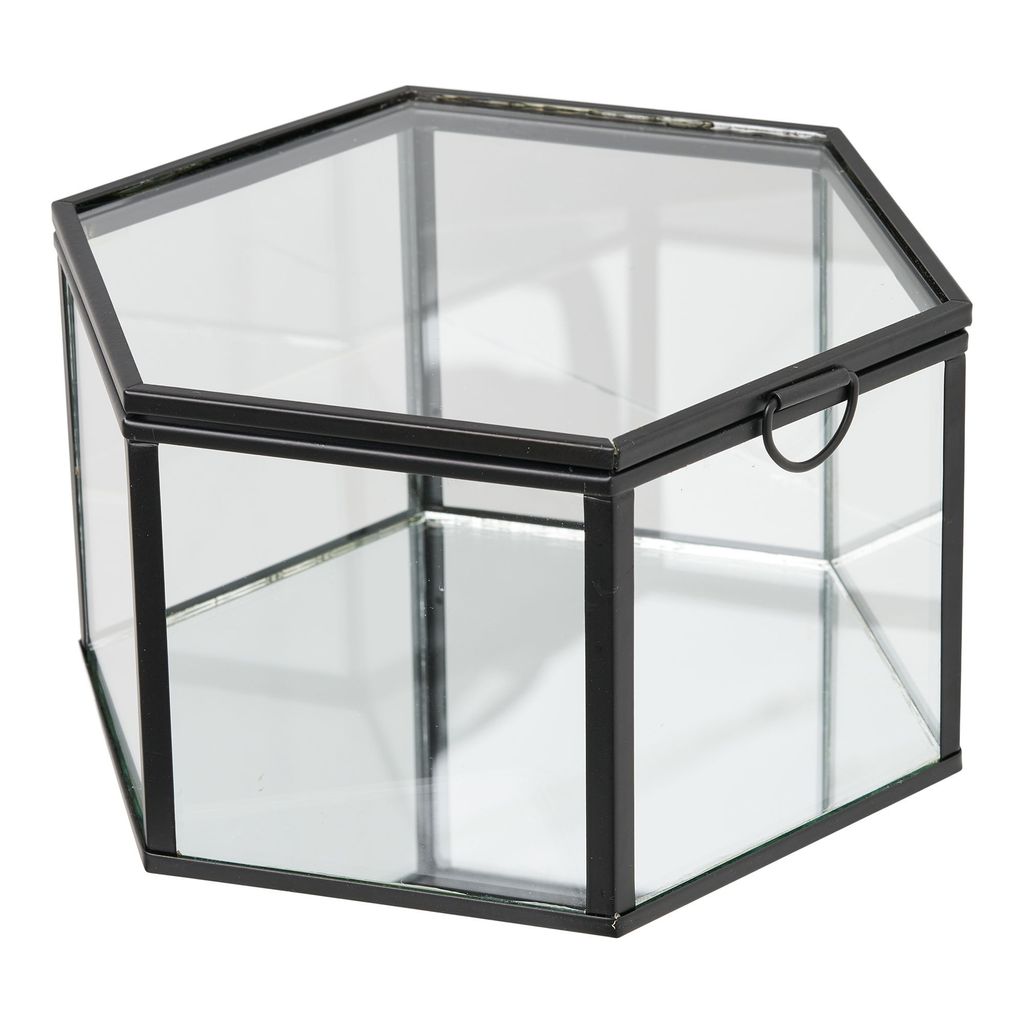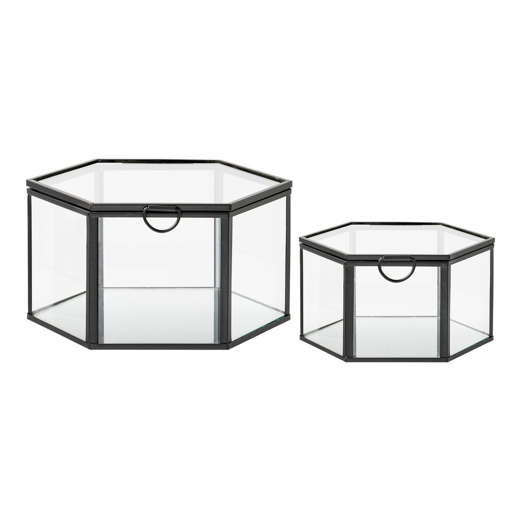 Dessa lådor kommer i två storlekar och är idealiska för att organisera små föremål eller för att lägga till en touch av elegans i din inredning. Den svarta metallramen ger en stilfull kontrast mot det klara glaset och de hexagonala formerna ger ett unikt visuellt intryck.