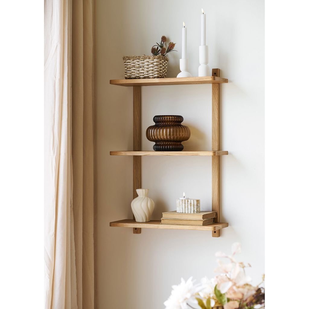 Denna väggkonsol har tre hyllplan som ger gott om utrymme för både dekoration och praktisk förvaring. Perfekt för allt från böcker och växter till dekorativa föremål. Den naturliga ekfärgen harmoniserar lätt med olika inredningsstilar och ger en tidlös känsla.