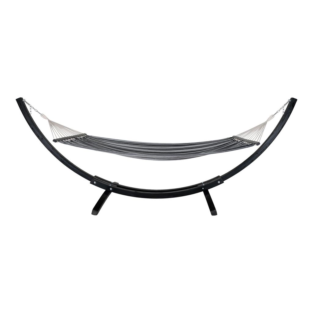 Designad i en sofistikerad grå och svart färgskala, smälter denna hängmatta enkelt in i vilken utomhusmiljö som helst. Det hållbara trästativet ger en stabil bas och är byggt för att tåla väder och vind.