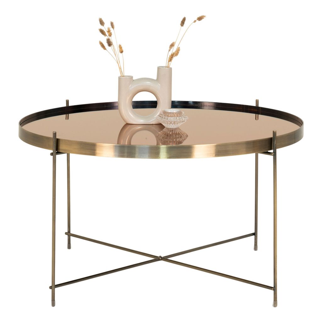 Material: Bordsskivan av glas ger en lyxig känsla medan den mässingsfärgade stålkonstruktionen ger stabilitet och hållbarhet. Den eleganta mässingslooken kompletterar olika inredningsstilar, från modern till klassisk.