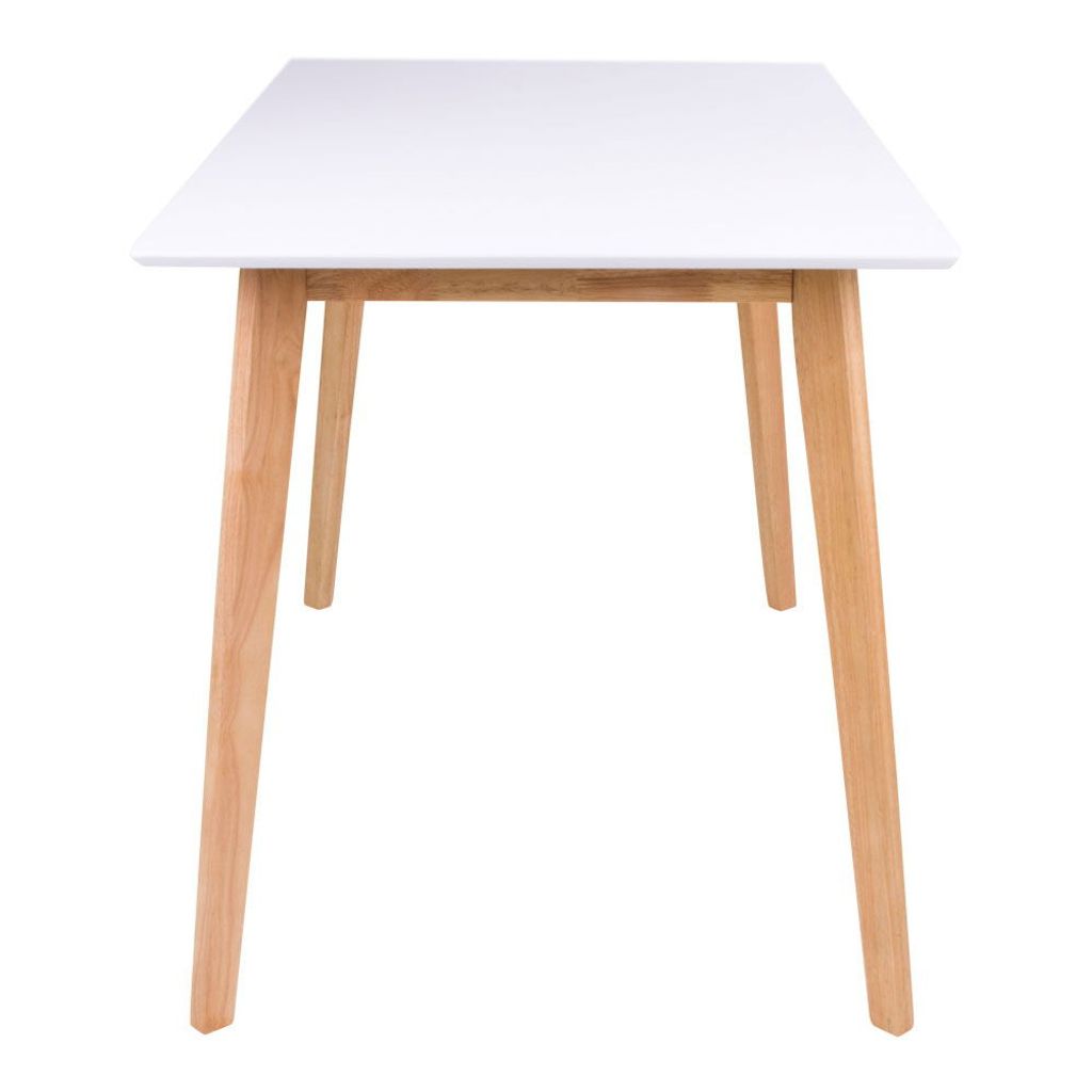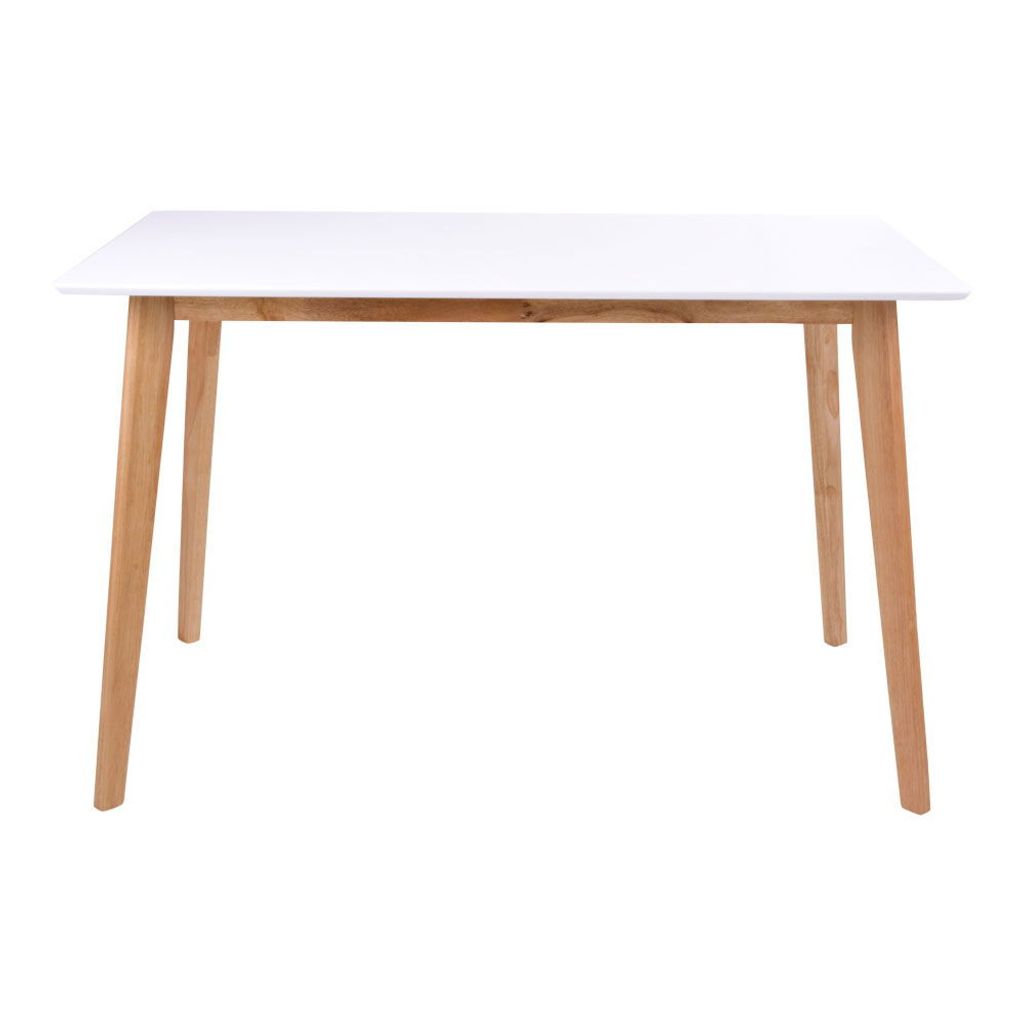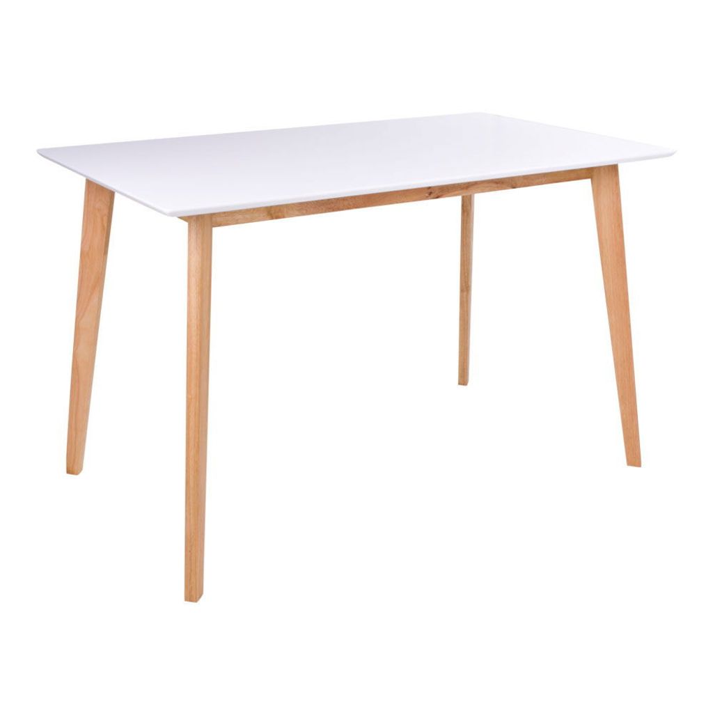 Stilrent matbord i vit MDF med ben av gummiträ, perfekt för det moderna hemmet.