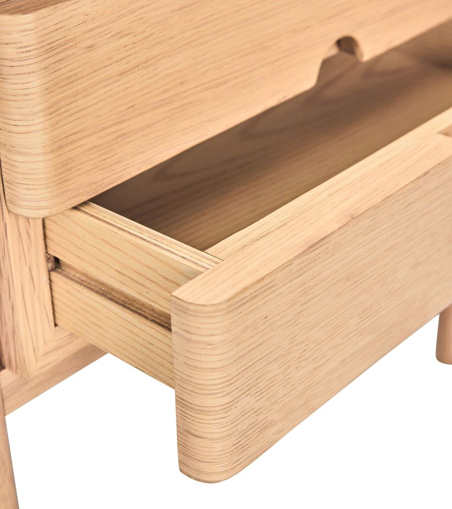 Sängbordet har två praktiska lådor med eleganta, runda handtag och en öppen hylla för extra förvaringsutrymme. Den släta ytan och de mjuka hörnen ger en modern men ändå tidlös design som passar alla inredningsstilar. Perfekt för att förvara böcker, lampor eller personliga föremål, detta sängbord är både praktiskt och estetiskt tilltalande.