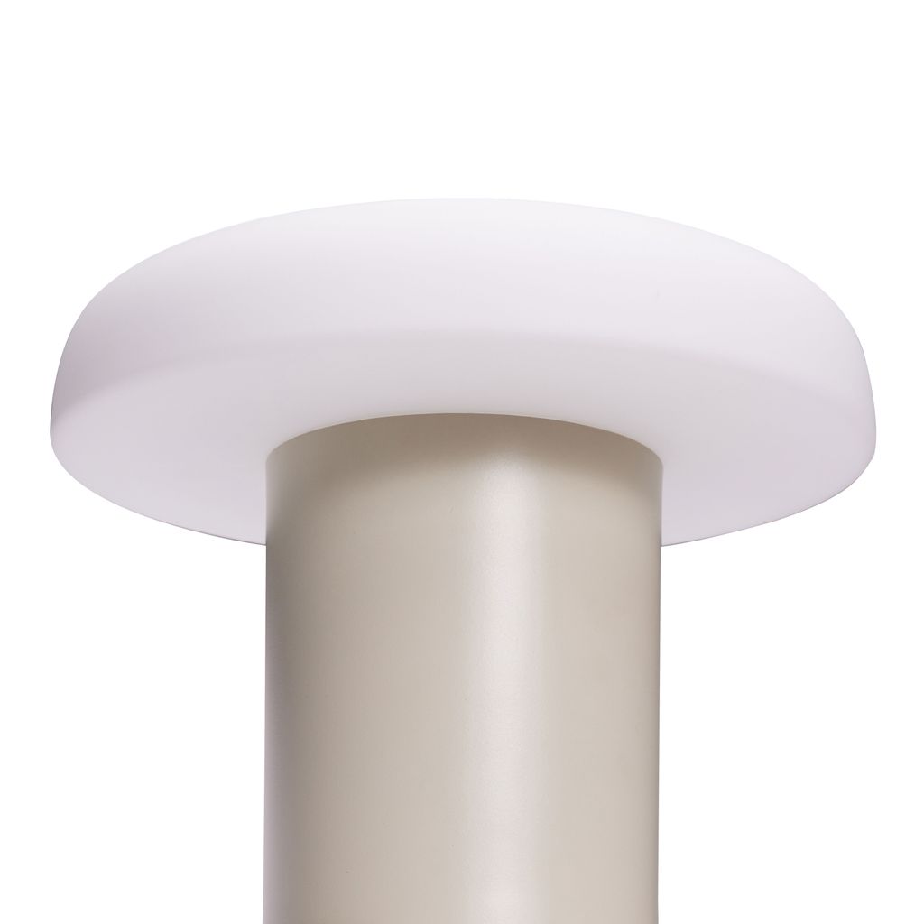 Lampans unika svampformade design med en sandfärgad bas och en mjuk, opalvit skärm ger ett behagligt och jämnt ljus, perfekt för sena kvällars läsning eller för att skapa en rofylld stämning.