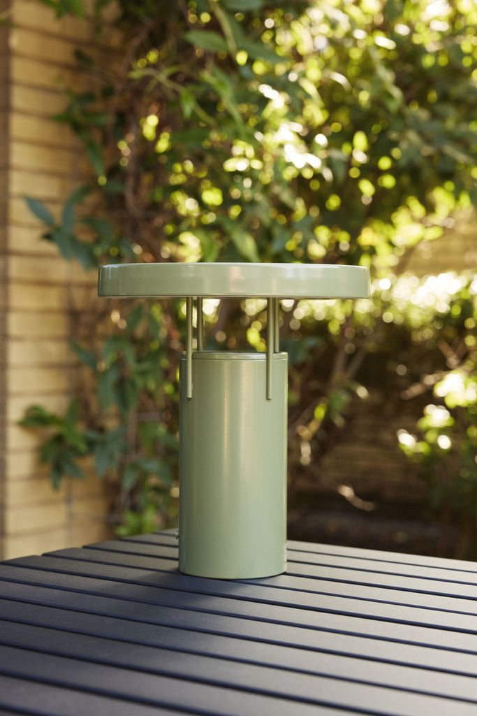 Elegant bärbar lampa i grön pulverlackerad metall. Dimbart ljus för både inomhus- och utomhusbruk, perfekt för alla miljöer.