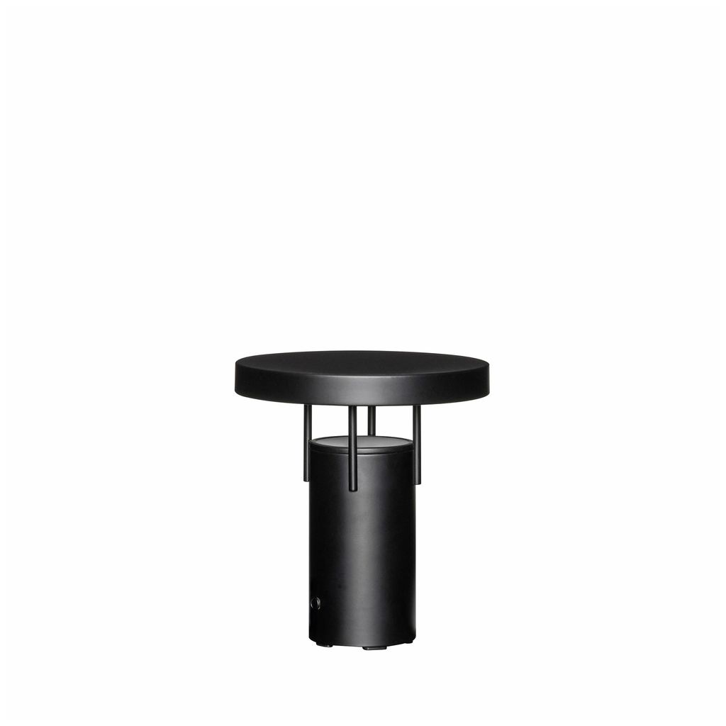 Elegant bärbar lampa med matt svart finish, flexibel placering och åtta timmars batteritid.
