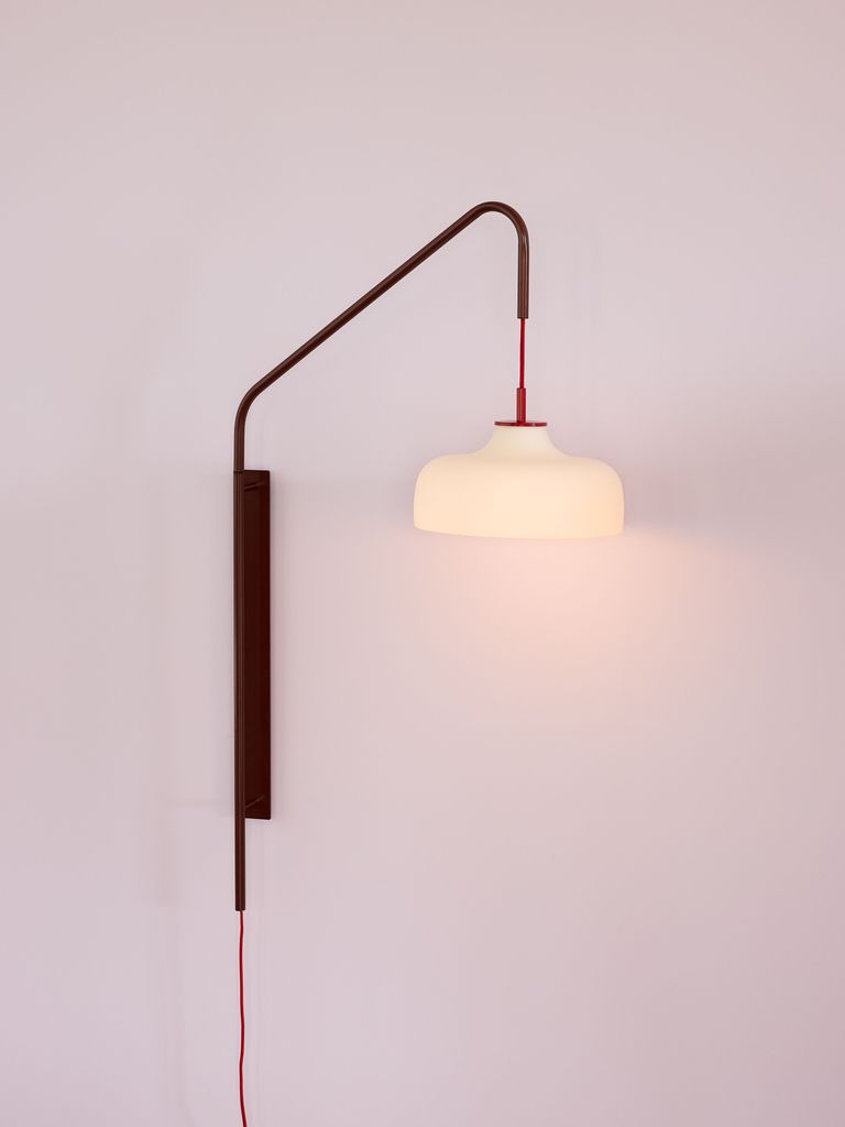 Elegant vägglampa i rödbrunt metall med opal glasskärm och ljusröd tygsladd. Perfekt för stilfull belysning.