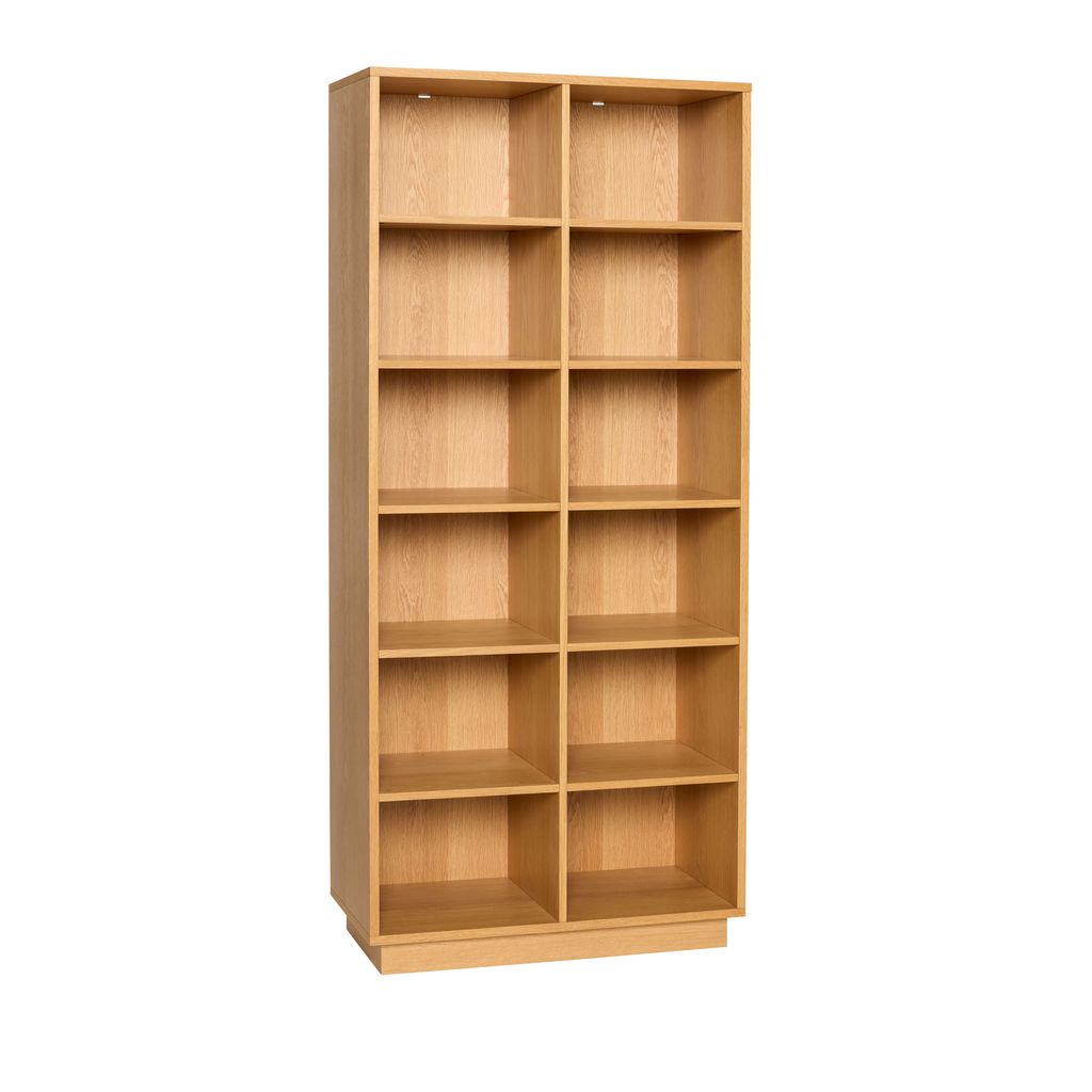 Elegant hylla med naturligt ekfaner, 12 fack för böcker och samlarobjekt. FSC-certifierat trä för hållbarhet.