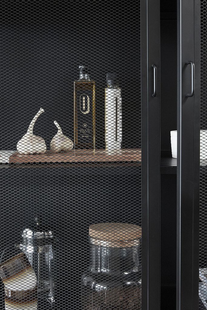 Stilrent dubbelskåp i matt svart järn med riklig förvaring och elegant gallerdesign.