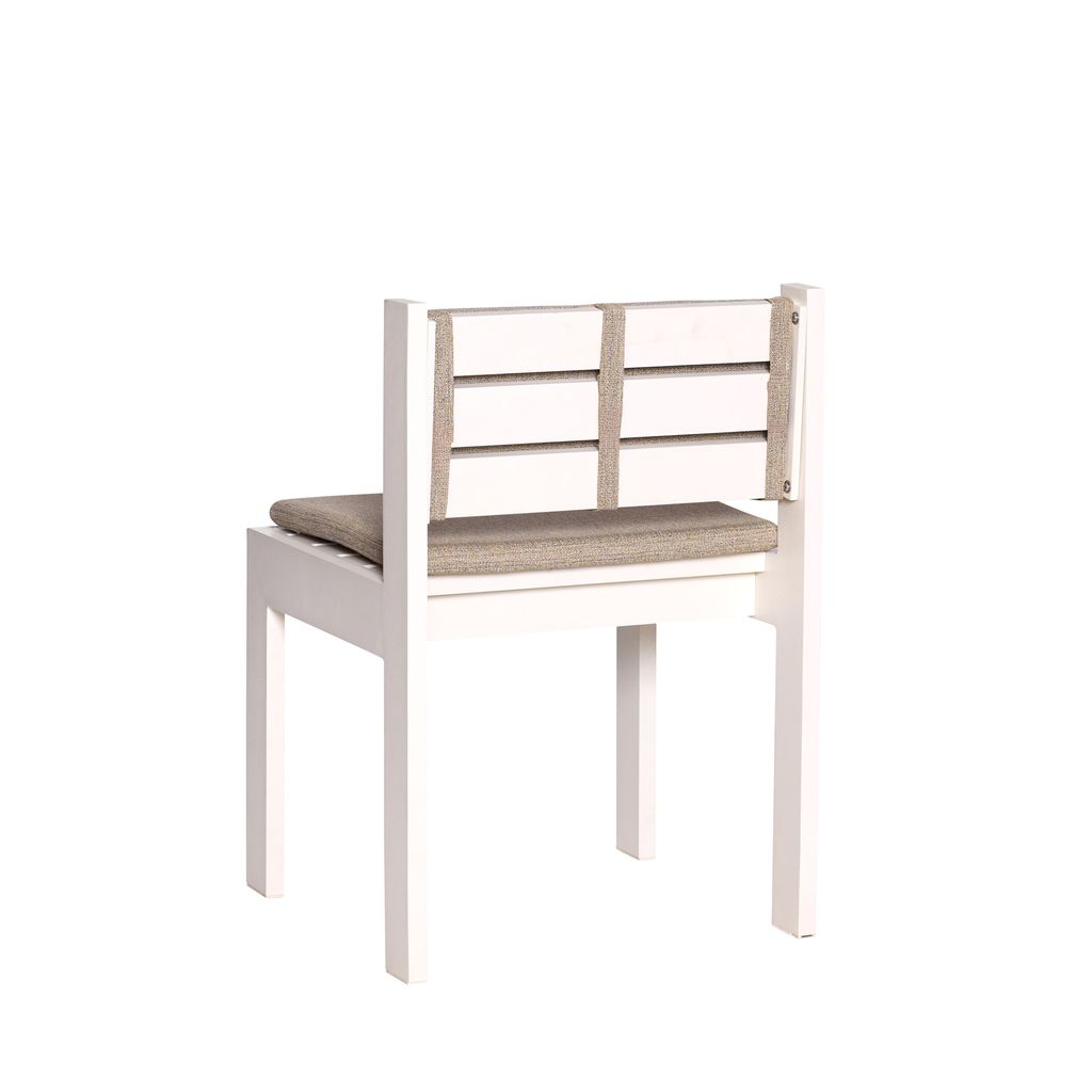 Elegant matstol i ljus beige med stabil och lätt aluminiumram. Perfekt för moderna hem med dess harmoniska design.