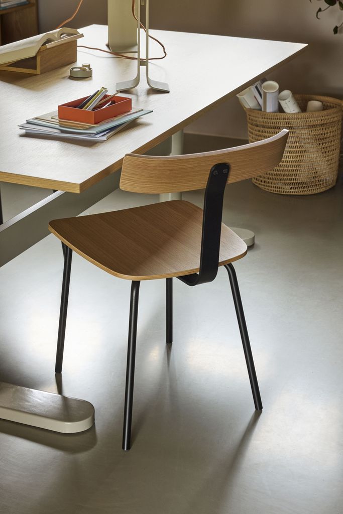 Stolen har en stark ram av järn som ger både stabilitet och ett modernt utseende. Sätet och ryggstödet, gjorda av fin ek, erbjuder komfort och stil – perfekt för långa middagar eller kreativa arbetsstunder.