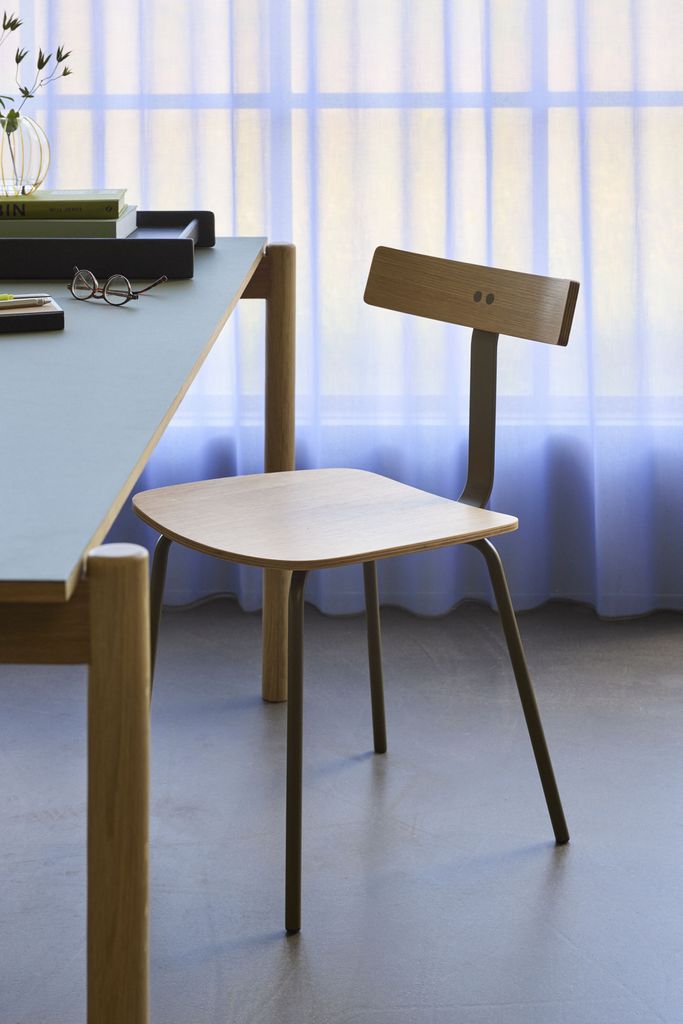Elegant matstol i naturoak och mild armégrön nyans. Hållbar och tidlös design med FSC-certifierat trä.