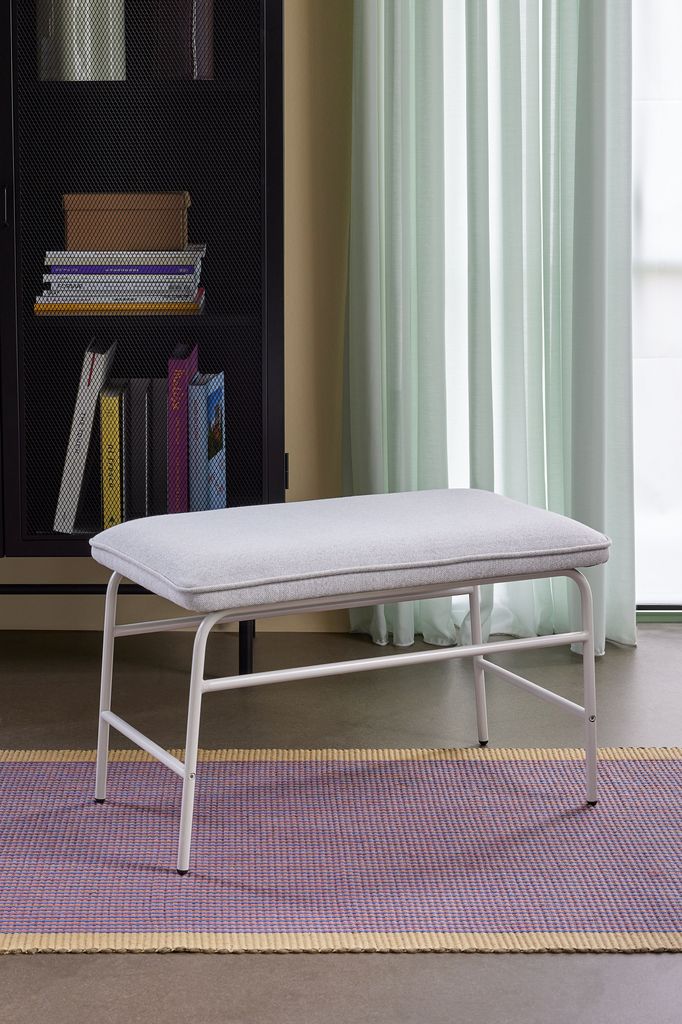 Elegant och hållbar bänk i grått med robust metallram och mjuk polyesterklädsel. Perfekt för alla rum.