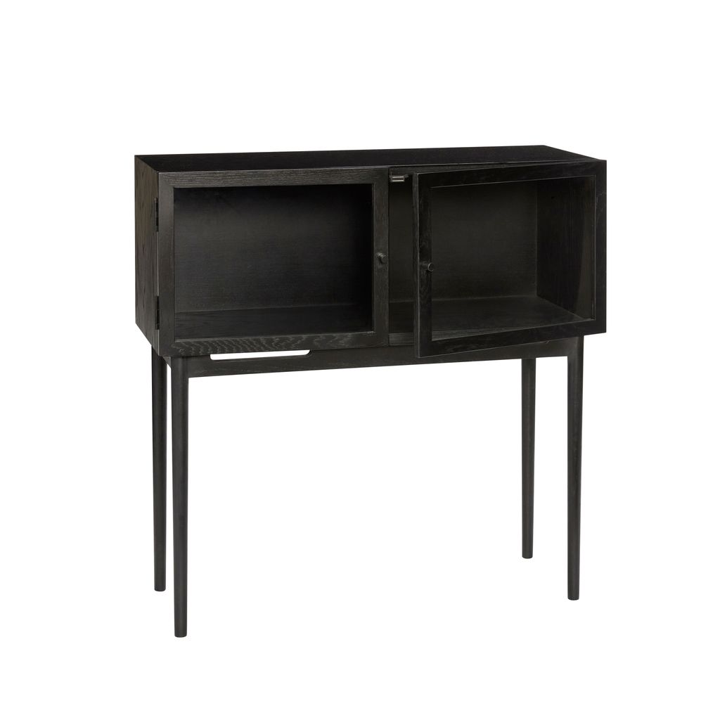 Elegant svart ekkonsolbord med glasdörrar. Perfekt för stilren förvaring och display av dina favoritsaker.