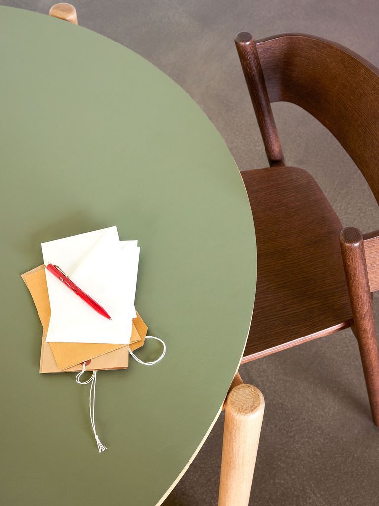 Det eleganta Oblique matbordet i olivgrönt med en linoleumyta och ekben ger rummet en sofistikerad känsla.