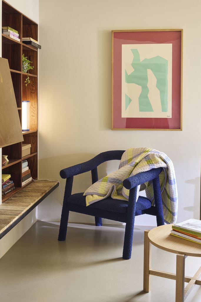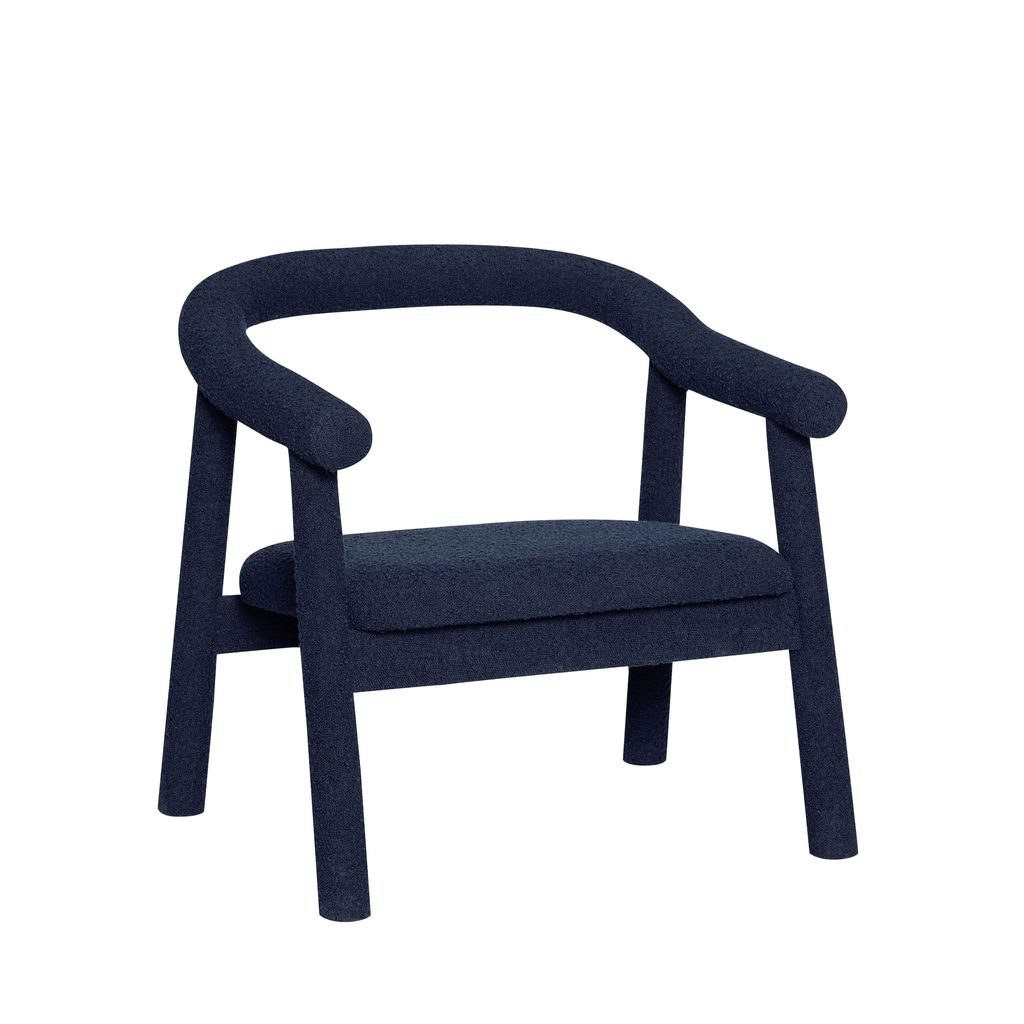 Stilren och bekväm loungefåtölj i mörkblå bouclé. Perfekt för elegant och modern inredning.