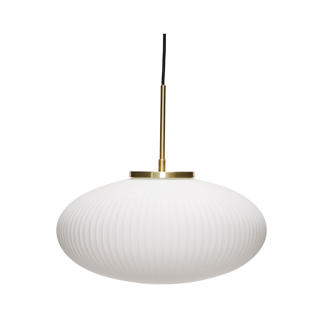 Upplev elegansen med Hübsch Serene Pendant Ellipse, en stilren taklampa som kombinerar klassiskt design med moderna detaljer. Denna lampa är tillverkad av högkvalitativt vitt opalglas, vilket ger ett behagligt och mjukt ljusflöde till rummet. De raffinerade mässingsdetaljerna kompletterar designen och tillför en touch av lyx.