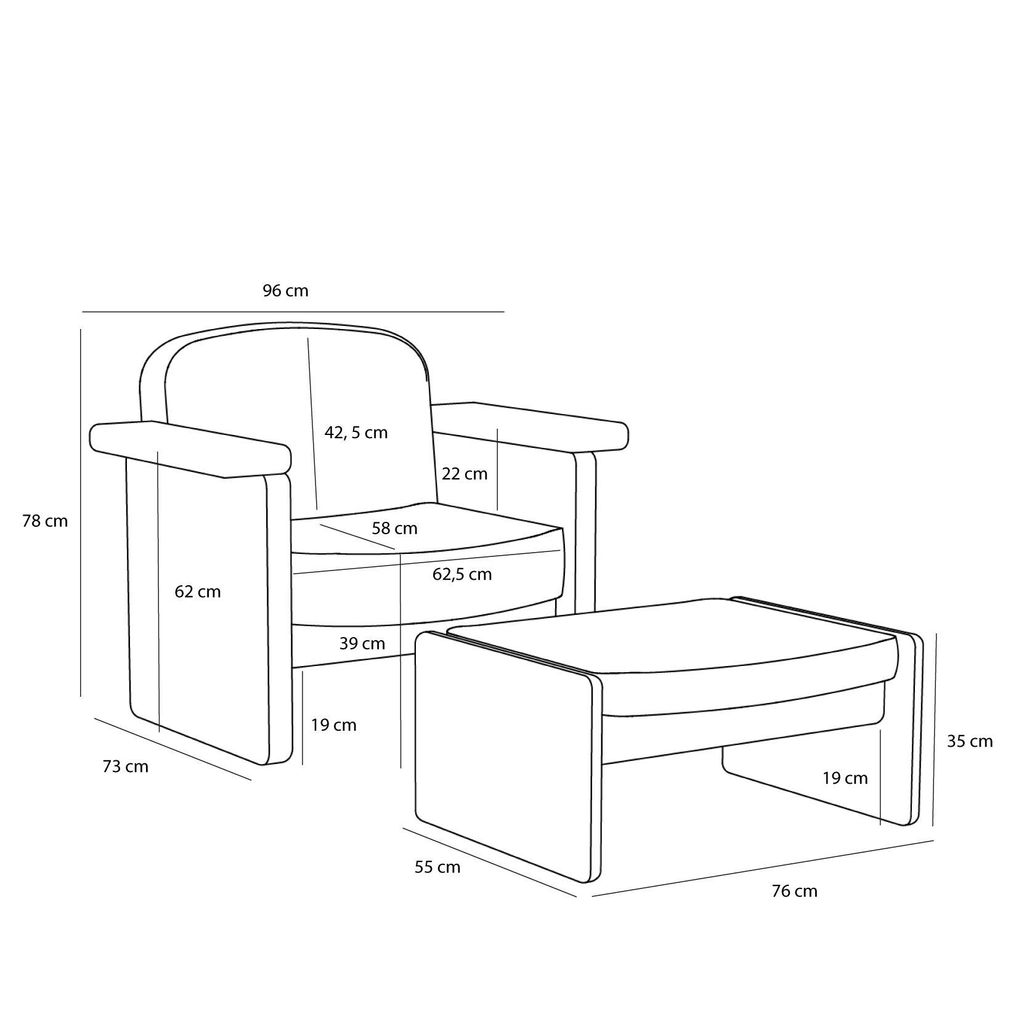 - Storlek: 96x73xh78cm (fåtölj), 76x55xh35cm (fotstöd)