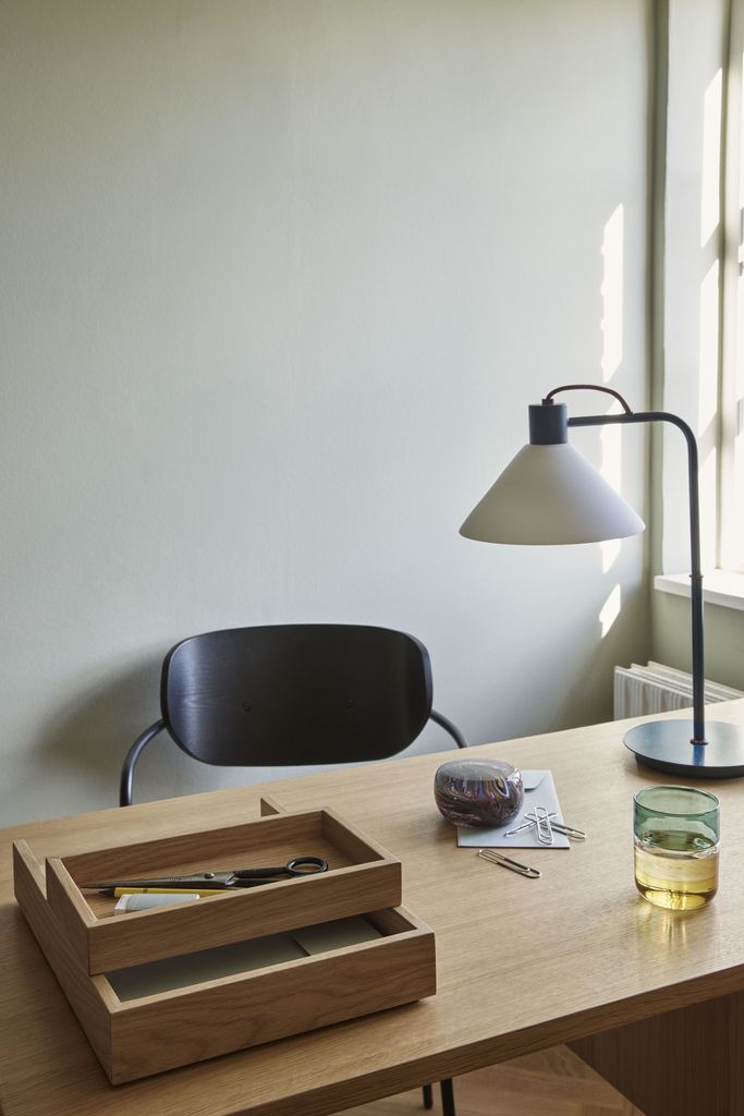 Den röda sladden tillför en subtil färgkontrast och bidrar till lampans moderna estetik. Perfekt placerad på skrivbordet eller sidobordet, erbjuder denna lampa både stil och funktion.