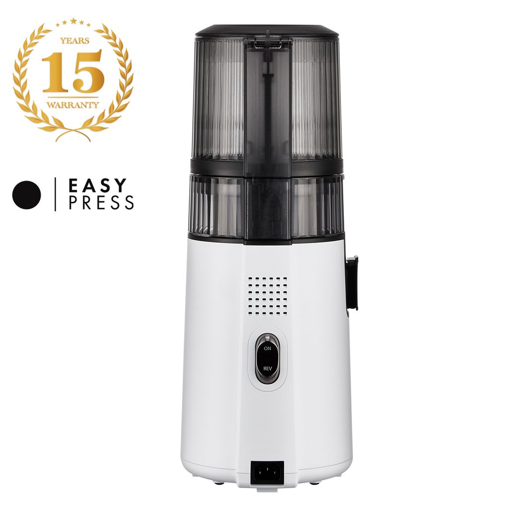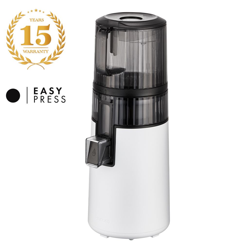 Hurom H70-FT i klassisk vit finish representerar Easy Press-serien och kombinerar kompakt design med premiumfunktioner. Med sin strainer-fria Multi-Auger-teknik och kristallskurna yta är den både lättanvänd och enkel att rengöra. Den generösa Smart Hopper klarar hela frukter och grönsaker utan förberedelser – perfekt för dig som vill ha enkel och näringsbevarande juicing.