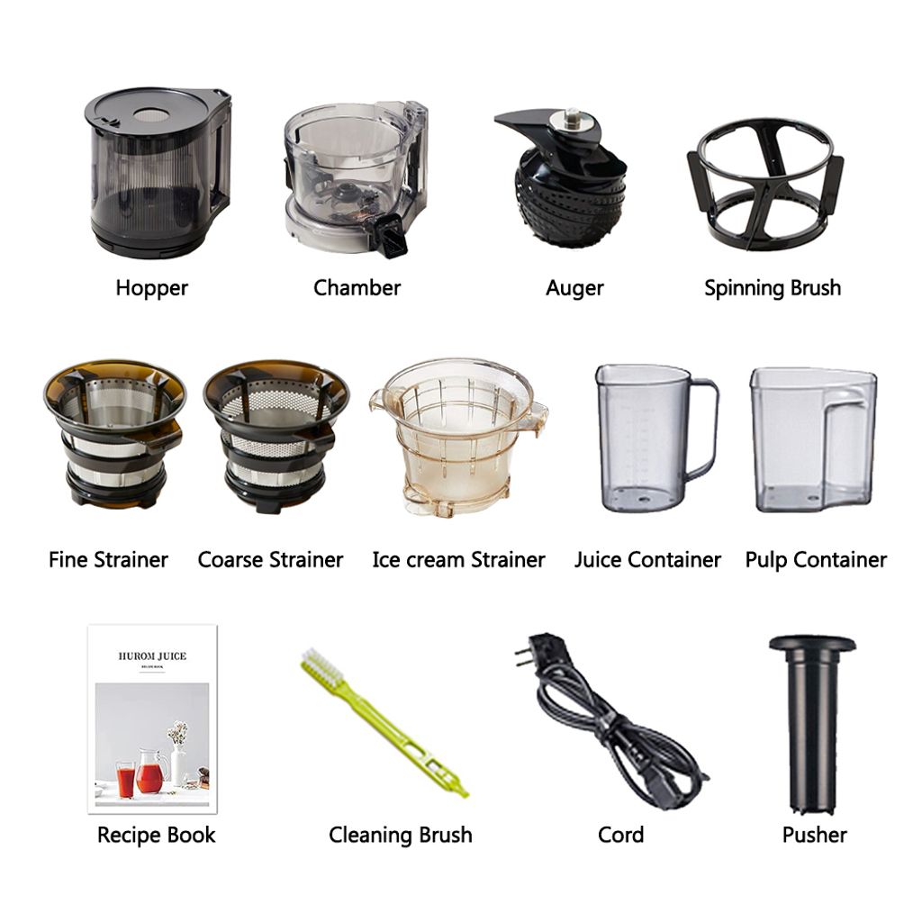 Tillbehör: Auger, olika silar (finkornig, grovkornig, glasssilar), rengöringsborste, receptbok, juice- och fruktskalbehållare m.m.