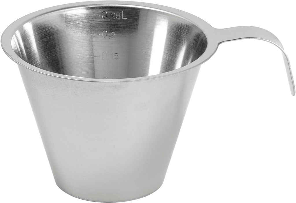 Traditionellt köksmått i rosfritt 18/10 stål. Med en kapacitet på 0,25 liter passar måttet utmärkt till såväl matlagningen i restaurangen som bakningen i bageriet. Ett perfekt köksredskap som tål daglig användning och rengöring, framtaget för den professionella verksamheten.