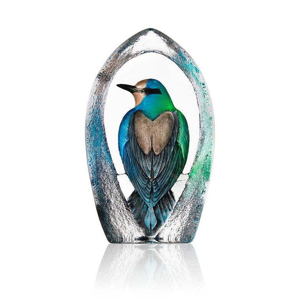 Upplev en värld av konst och hantverk med Målerås Colorina Blå, Ltd Ed 199ex. Detta magnifika gjutna glasblock i kristall, designat av Mats Jonasson, pryds av en målad fantasifågel i livfulla blå och gröna toner. Fågelns intrikata detaljer i kombination med det klara kristallen skapar en hypnotiserande visuell effekt.