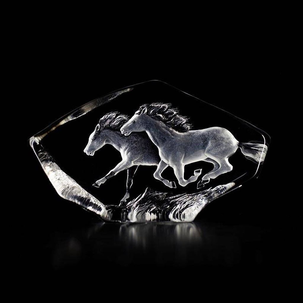 Exklusivt handgjort kristallblock från Målerås med graverat hästmotiv, signerat av designern. Perfekt som gåva.