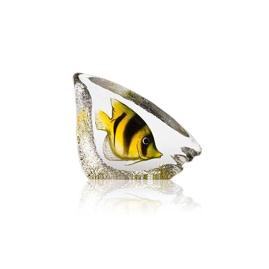 Upplev skönheten av undervattensvärlden med Målerås Korallfisk, en utsökt kristallskulptur som fångar essensen av en livfull korallfisk. Skulpturen är noggrant utformad i ett gjutet kristallblock där fiskens grönaktiga nyanser elegant kontrasteras mot kristallens klarhet. Varje block är handgjort i Målerås och bär Mats Jonassons signatur, vilket garanterar äktheten och hög kvalitet.