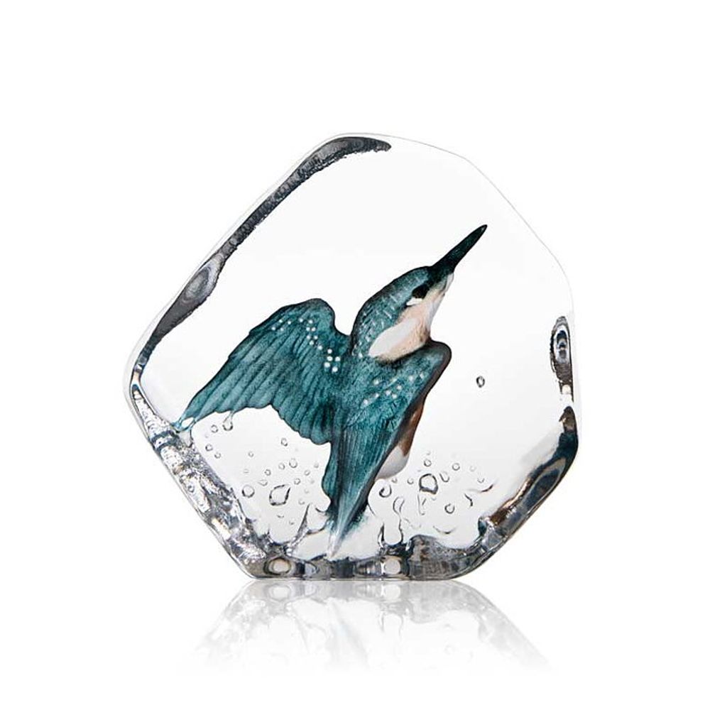 Handgjort kristallblock med färgsprakande kungsfiskare, designat av Mats Jonasson.