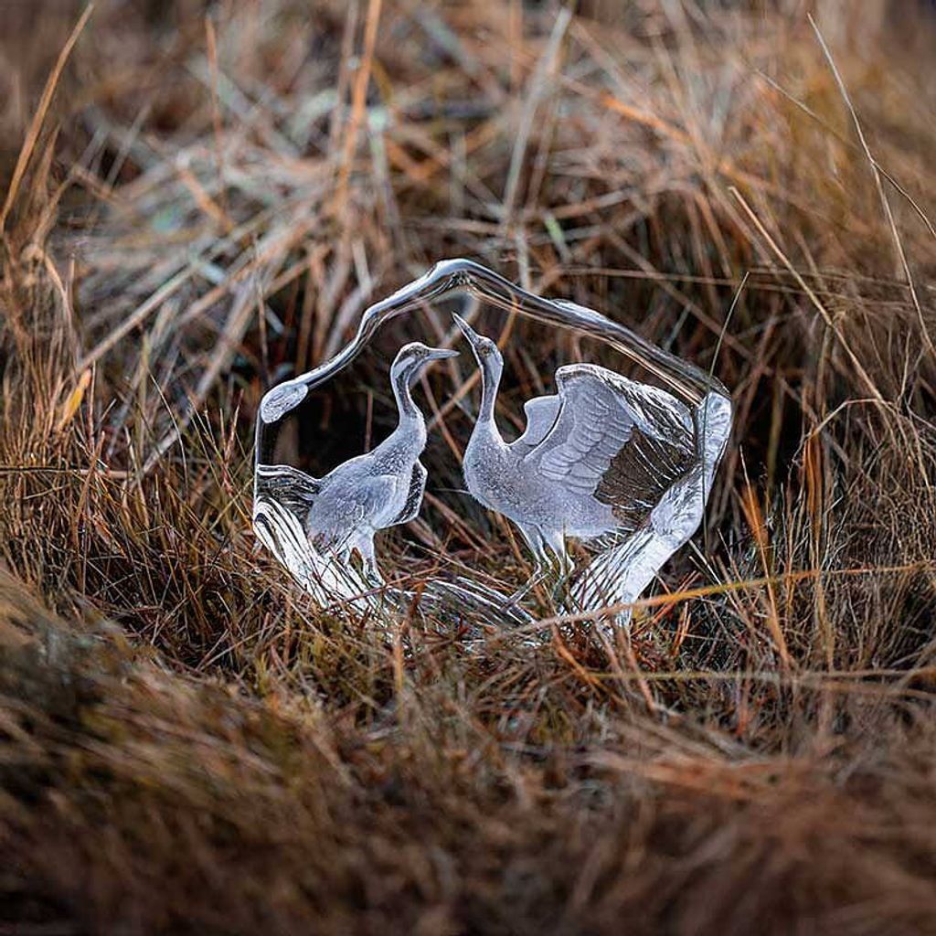Exklusivt handgjort kristallblock från Målerås med graverat tranmotiv, perfekt för både samlare och som en unik gåva.