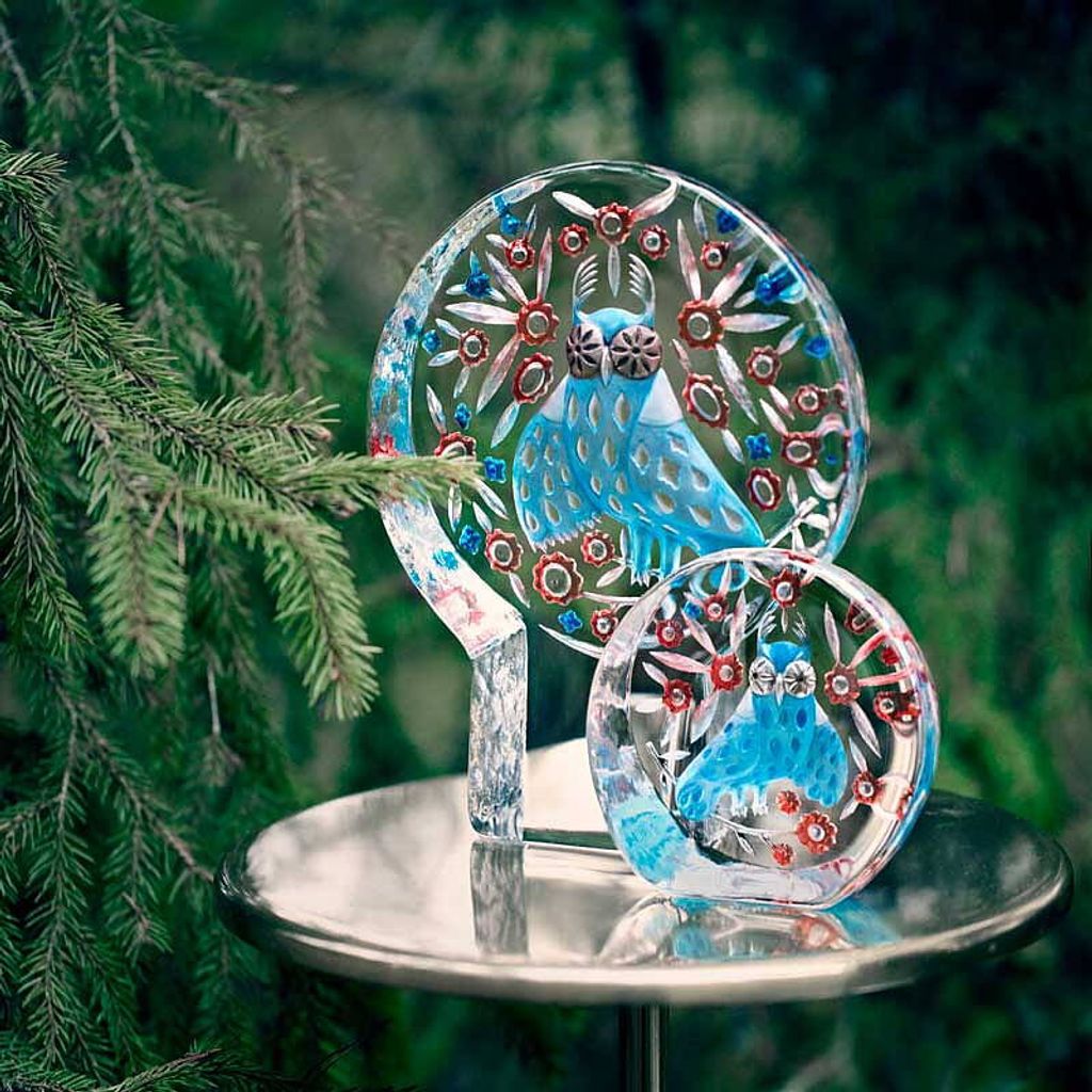 Unik handgjord kristalluggla designad av Klaus Haapaniemi, färgsprakande och miljövänlig.