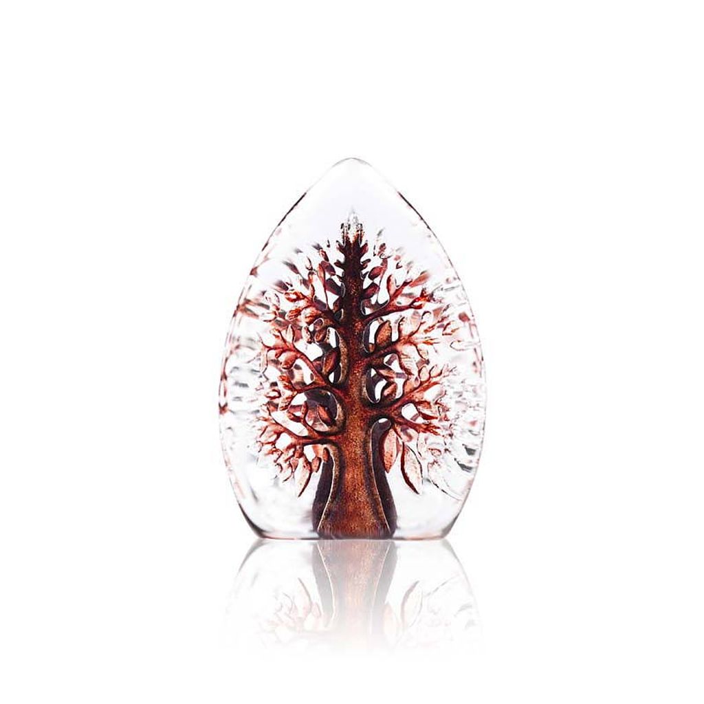 Skulpturen är gjuten i kristall, sandblästrad och handmålad med organiska färger. Den unika trekantiga formen speglar trädet och ger en vacker tredimensionell effekt. Ett svenskt hantverk som levereras i en elegant presentkartong.