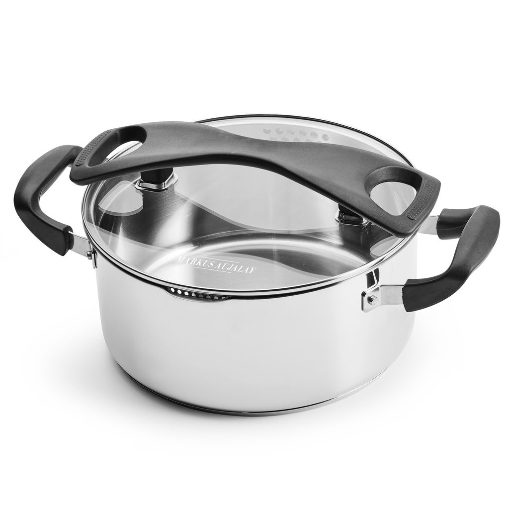 Mångsidig gryta i rostfritt stål med ergonomiskt glaslock och praktiska handtag. Perfekt för alla typer av spisar.