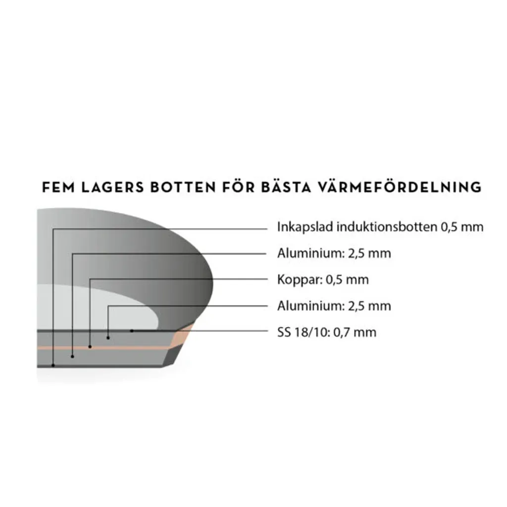 Högkvalitativ stekpanna i rostfritt stål med ergonomiskt handtag och fem lager för optimal värmefördelning.