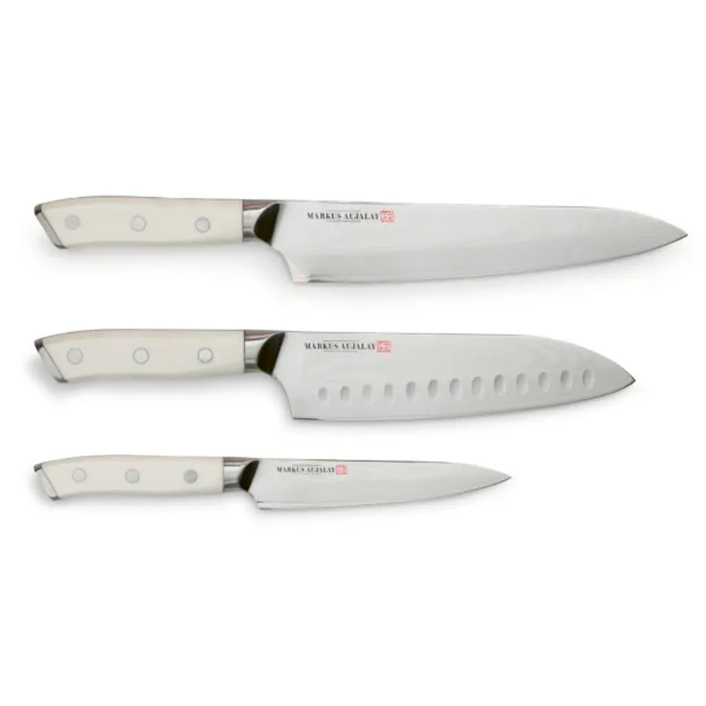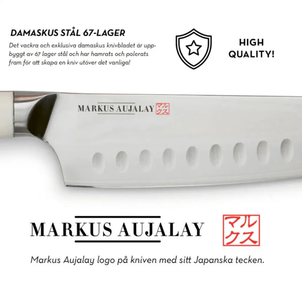 Detta exklusiva knivset från Markus Aujalay kombinerar modern design med överlägsen kvalitet och funktion. Varje kniv i setet är försedd med ett bekvämt vitt handtag som ger ett säkert och optimalt grepp, vilket gör dem perfekta för både professionella och hemmakockar.