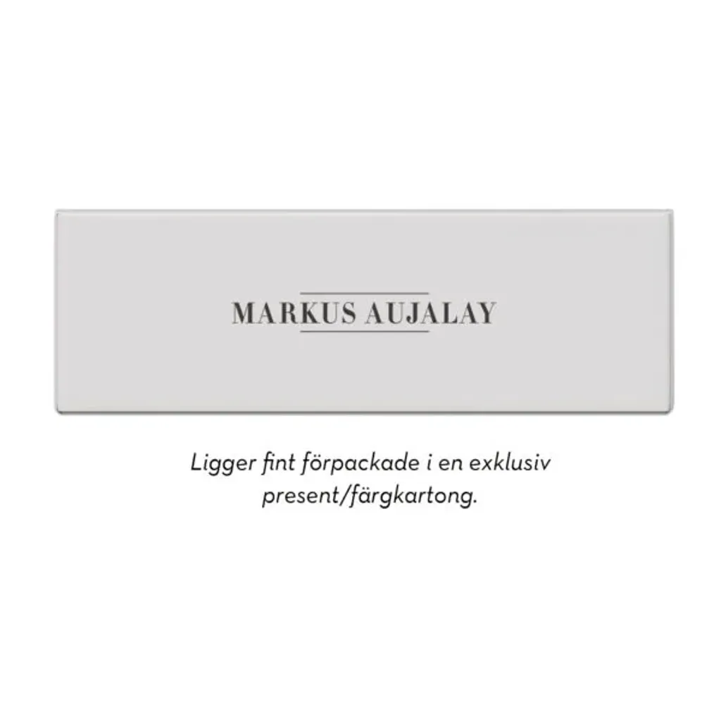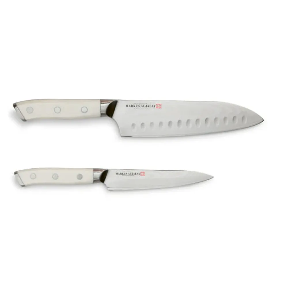 De vita, ergonomiska handtagen ger ett bekvämt grepp och är idealiska för både proffs och hemmakockar. Markus Aujalays logotyp är subtilt präglad på bladet, vilket förstärker dess exklusiva utstrålning.
