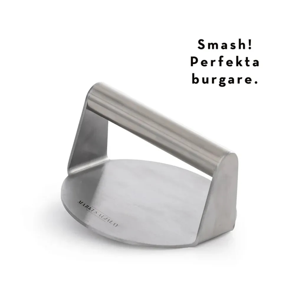 Elegant smasherset i rostfritt stål och trä, perfekt för att skapa saftiga, jämna hamburgare.