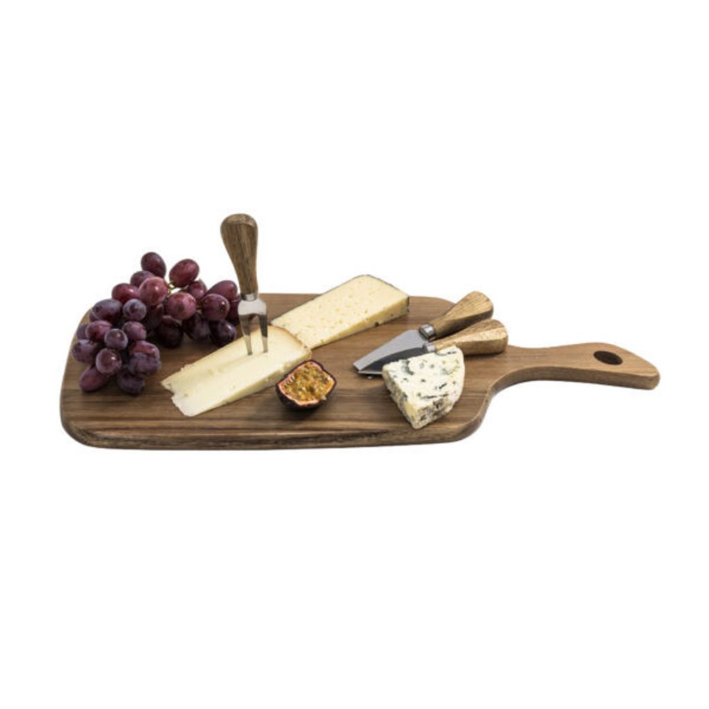 Stilfull tapasbräda i acaciaträ med tre eleganta bestick. Perfekt för en smakfull matupplevelse.